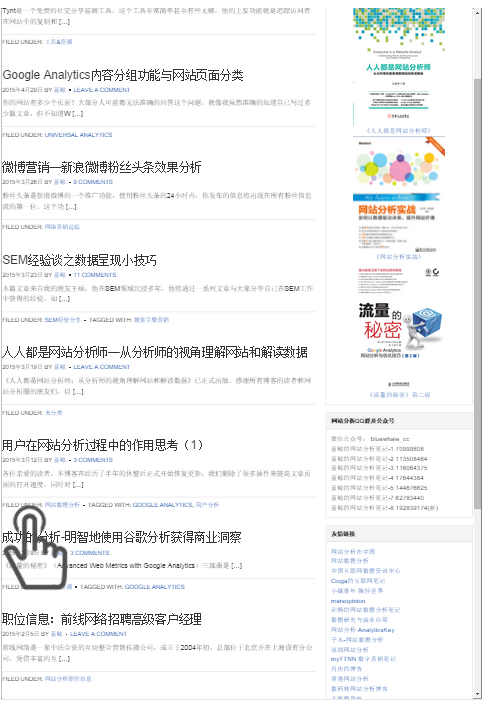 Mouseflow在“录像”回放界面中会模拟用户的设备所看到的页面,并在此之上还原访问者的鼠标移动,点击等行为。你可以在Mouseflow的Demo中http://mouseflow.com/demo/进行体验。以下是Mouseflow“录像”中记录到的通过iOS设备访问博客的用户行为。其中标识了用户手动滑屏的行为。