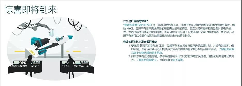 这里的介绍是:管理买家参与度(MYCE)是一款测试版免费工具,适用于拥有店铺页面和关注者的品牌所有者。借助MYCE,品牌所有者只需选择他们想要突出显示的商品、自定义带有徽标和商品图片的电子邮件,并选择最适合他们的时间范围,即可轻松向亚马逊上的关注者启动电子邮件营销广告活动品牌所有者可以根据广告活动效果指标来制定未来的营销计划。